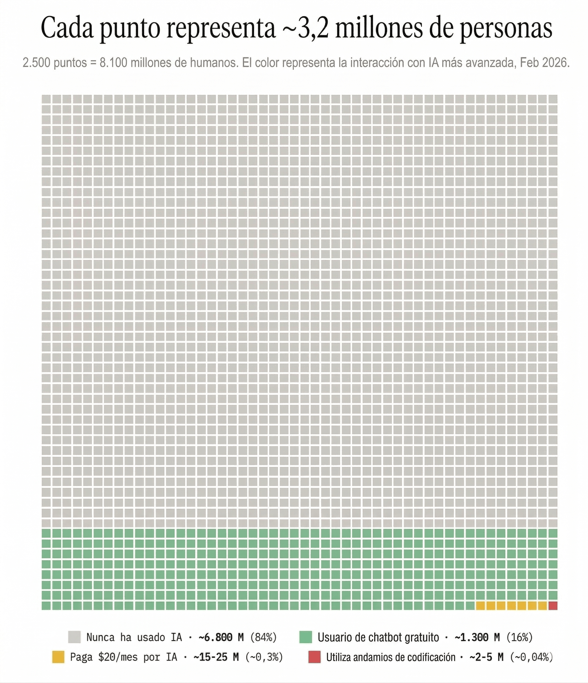 Echa un vistazo a la imagen de arriba. Cada pequeño punto representa a 3,2 millones de personas. La inmensa mancha gris es el mundo que aún vive en la era "pre-IA". Si estás leyendo esto y usas ChatGPT, Claude o Gemini en tu día a día, ya formas parte de una élite del 16%.